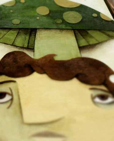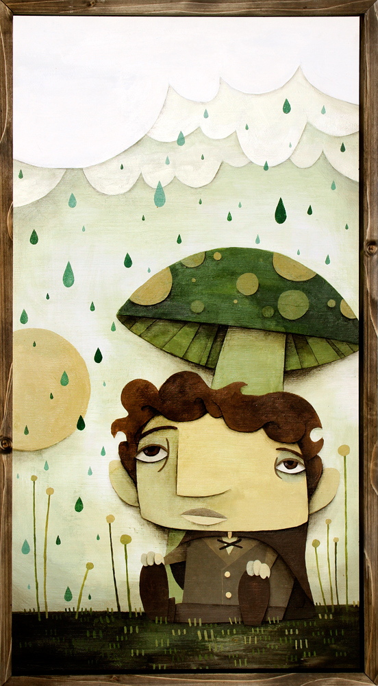 "Mushroom Umbrella" 2010 24x40, Mixex Media on wood. There's nothing quite like a mushroom to keep the rain at bay. Especially a green one with orange spots on it. That's the kind of mushroom I would choose.